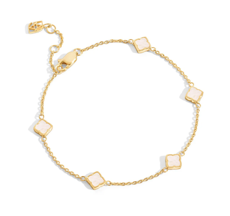 The stations are connected by a fine, shimmering chain crafted from premium gold-plated alloy, providing a high-shine finish that beautifully complements the soft white tones of the inserts. Its adjustable lobster claw clasp and extender chain ensure a custom, comfortable fit for any wrist size, while a signature geometric charm adds a final touch of designer flair.