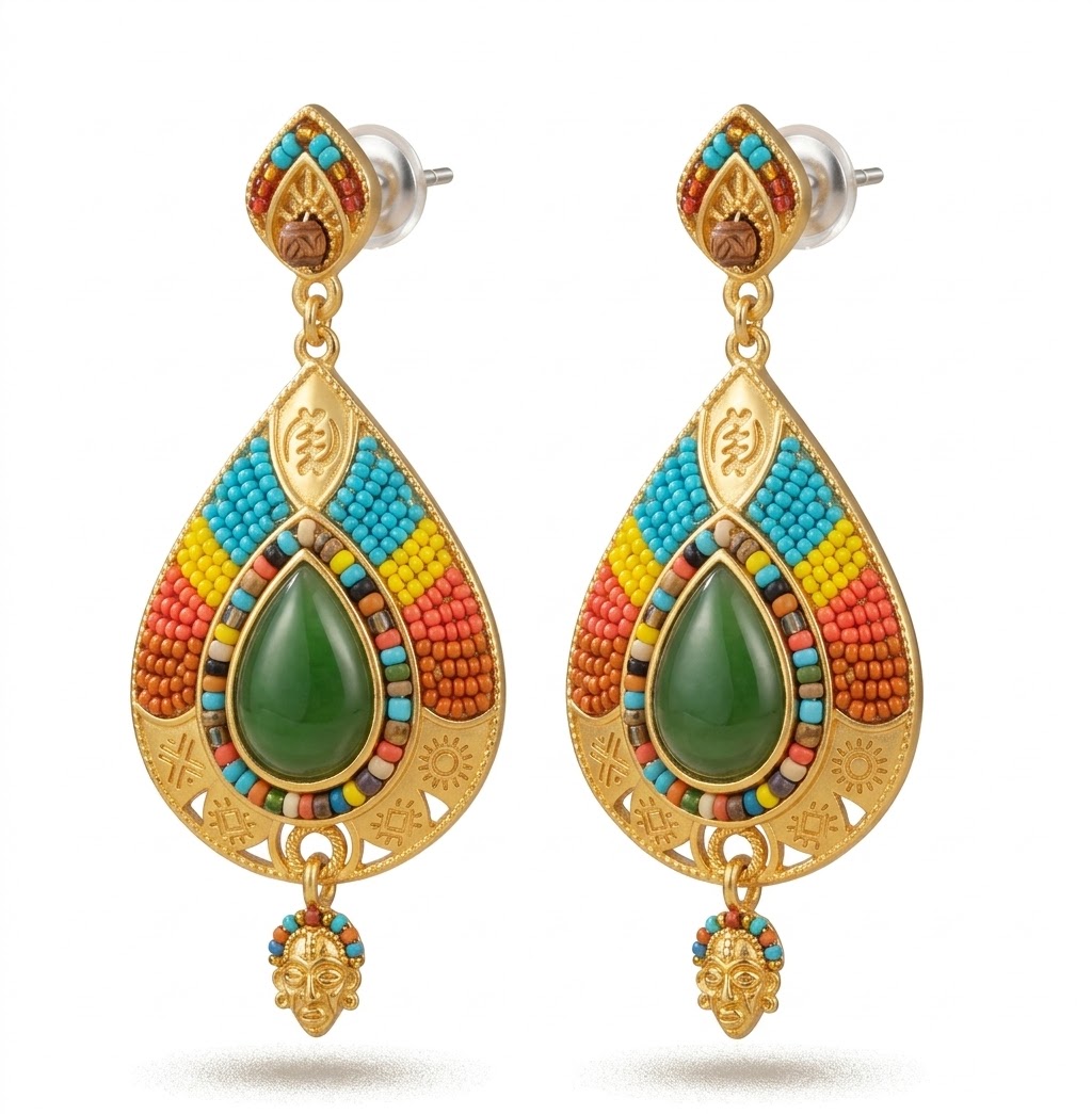 The fusion of textured gold, colorful glass beads, and the grounding green centerpiece creates a “Global Chic” aesthetic that is both regal and earth-bound. Whether paired with a flowing kaftan, a structured linen blazer, or an evening ensemble, these earrings serve as a striking conversation piece that honors the timeless traditions of the continent.